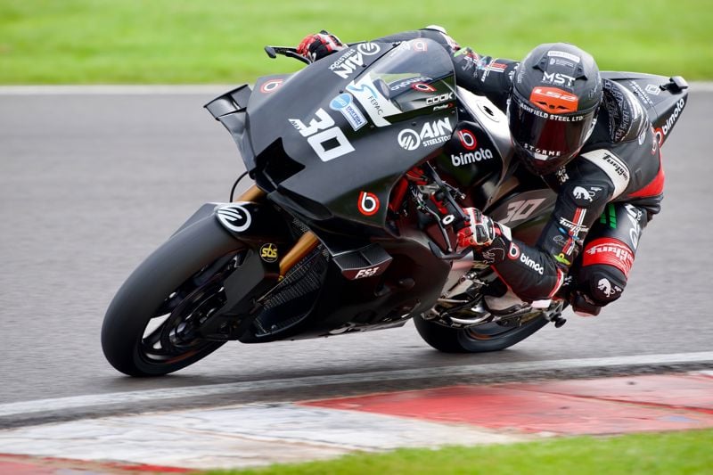 The AJN Steelstock bimota debuted in the ZYN British Superbike Championship at Donington Park with Max Cook topping the opening track session at the R&G Official Test by 0.061s from Josh Brookes as the 2026 season got underway.
